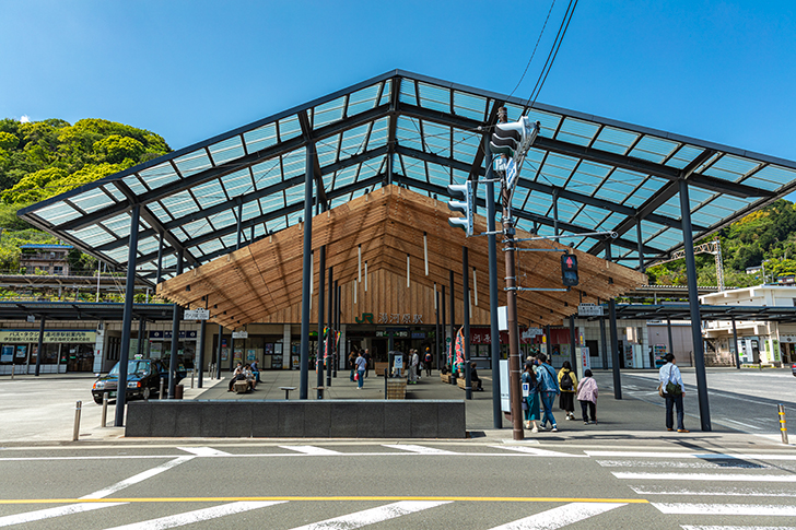 湯河原駅改札を出たら、目の前の信号を渡り右側に進みます。